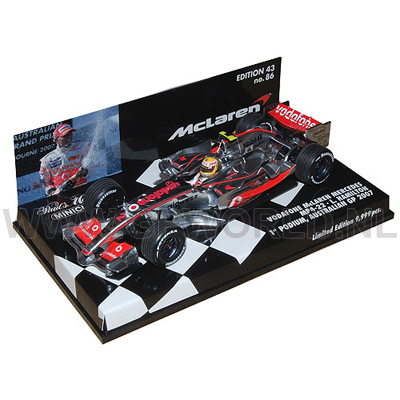 Onderstaand de foto van de 1/43 Lewis Hamilton 1st podium schaalmodel die binnenkort uitkomt. Leuk model als je er zo naar kijkt en verder nog geen normale 1/43 2007 Lewis Hamilton in de kast hebt staan. Dus in Januari dit jaar kwam de 1/43 2007 Lewis Hamilton auto uit. Dan heeft Minichamps nog eens 7 maanden nodig gehad om een doosje met Lewis erop te bedenken en uit te brengen onder de noemer Lewis Hamilton 1st podium. Maak er dan wat leuks van! Een juichend figuur erbij, een flipbox, 1/8 helmpje erbij, versleten banden, vuil op auto, 1/43 champagne spuitend figuur erbij, etc. Er valt genoeg te bedenken. Alles is beter als de standaard auto te pakken en in een andere verpakking uit te brengen en deze gelimiteerd aan te bieden. Hoewel gelimiteerd....9999 stuks kan je niet gelimiteerd noemen. 9999 stuks staat eerder gelijk aan ongelimteerd. Dan hoor je iemand van Minichamps zeggen: "ja, maar 9999 stuks wereldwijd is niet veel". Wereldwijd? Een stukje van Europa en een stukje Noord Amerika alleen bedoel je! Alsof er in Zuid Afrika of Afghanistan Hamilton modellen te koop zijn? Eten hebben we niet maar wel een Hamilton model in mijn hut! Met gelimiteerd wereldwijd wordt er bedoeld: 9999 stuks verdeeld over 5% van de wereldbol.