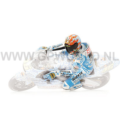 Binnenkort komt van Minichamps het Valentino Rossi figuur uit voor de 2001 Mugello motorfiets. Dit is de Hawai/ bloemetjes livery op de Honda waarmee Rossi in de regen onderuit ging. Klik hier om te bestellen.